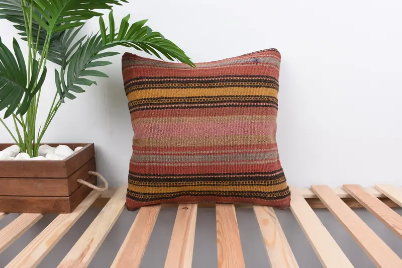 Kahverengi & Pembe Çizgili Yastık, İşlemeli Vintage Kırlent