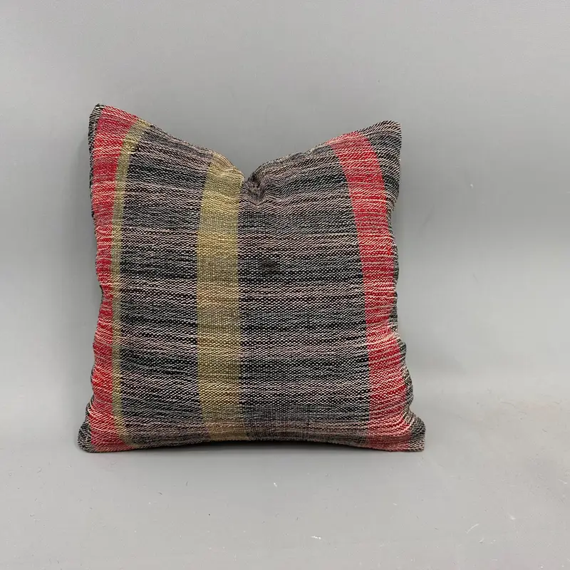 El Dokuma Yeşil & Kırmızı Çizgili Kilim Kırlent, Vintage Nakışlı Yastık