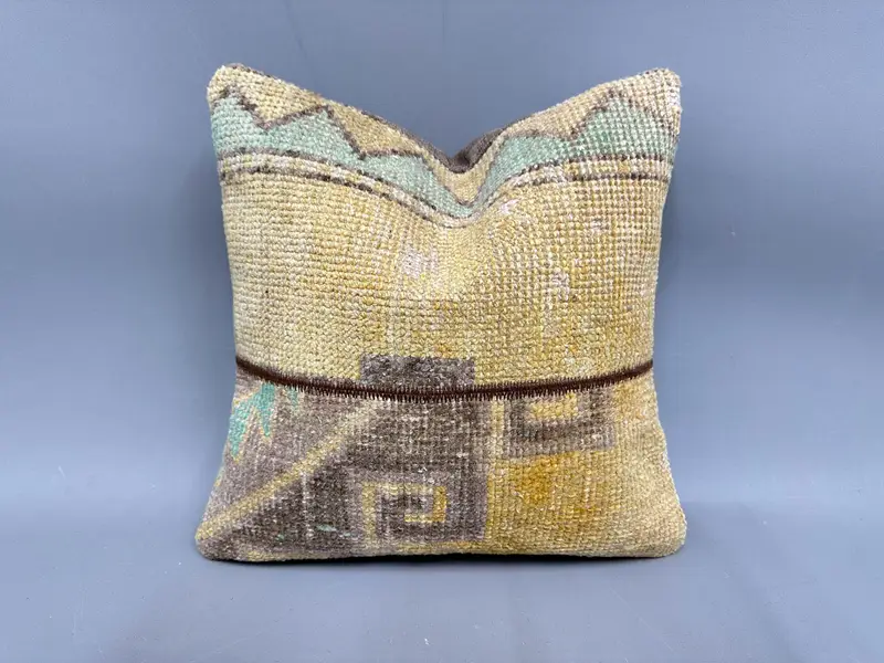 Kahverengi ve Yeşil Patchwork Kırlent, İşlemeli Vintage Yastık