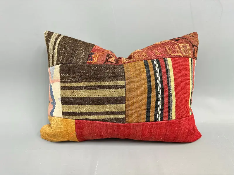 Kırmızı & Kahverengi Patchwork Kırlent, El Yapımı Vintage Kilim Minder