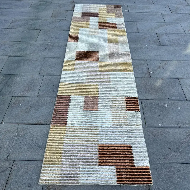 Zarif Beyaz Halı, 2,5x9,3 ft Sarı Geometrik Çiçekli