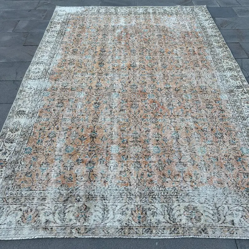 Canlı Turuncu ve Mavi Halı, 6,6x9,7 ft İran Desenli