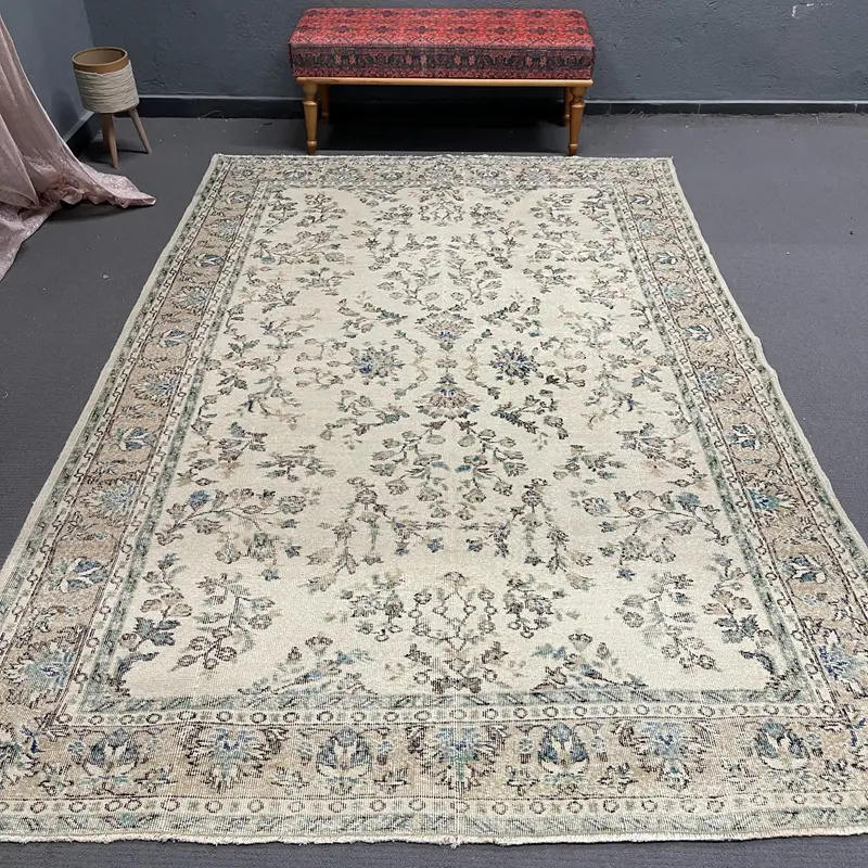 Zarif Bej ve Yeşil Halı, 6,5x9,6 ft Çiçek ve Geometrik
