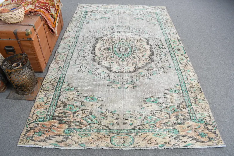 5.1x8 ft Gri Fas Halısı, Yeşil Vurgular