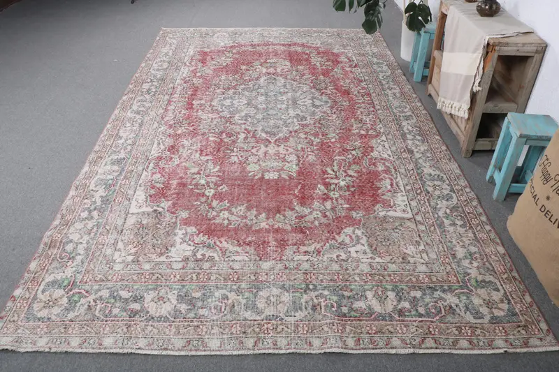 Kırmızı ve Mavi Halı, 6,4x10,4 ft Çiçek ve Geometrik