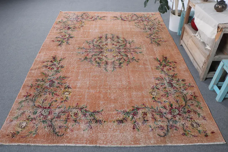 Canlı Turuncu Halı, Yeşil Vurgulu 6x8,5 ft