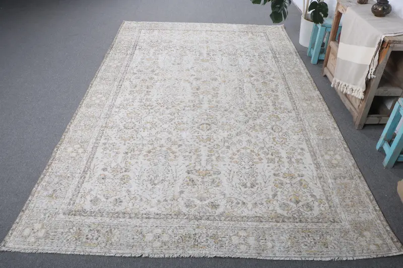 Zarif Bej ve Sarı Kareli Halı, 5,9x9,1 ft