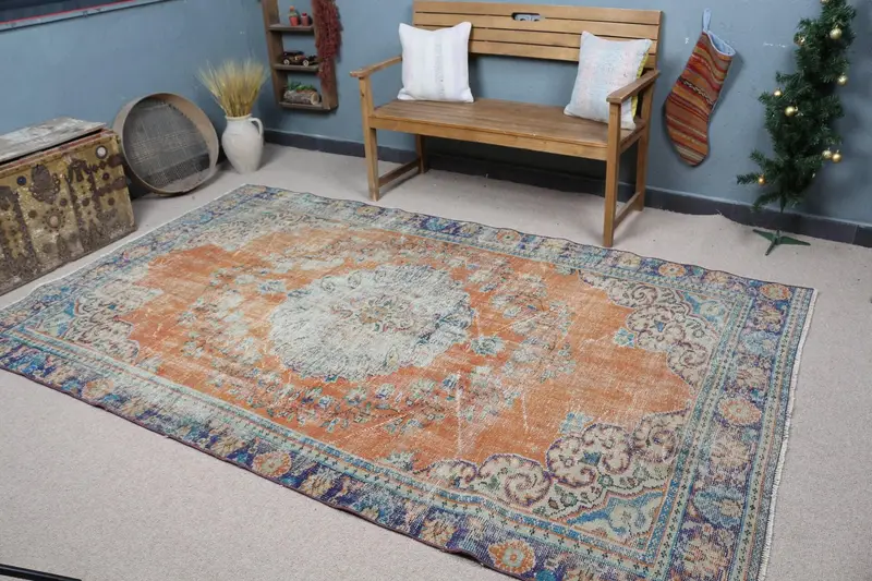 5.4x9.2 ft Turuncu ve Mavi İran Halısı, Zarif Dekor
