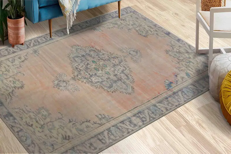 Soluk Etnik Çiçek Baskılı Halı, Vintage Türk Oushak Tasarımı