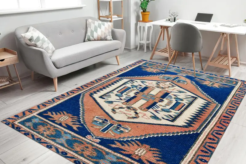 Vintage Türk Geometrik Baskılı Halı: Etnik Desenli ve Zengin Tasarım
