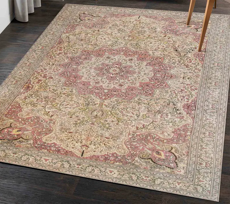 Pembe & Yeşil Madalyonlu Vintage Türk Baskılı Halı, Antik Stil