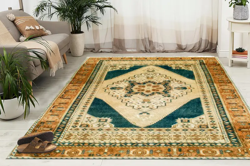Madalyon Esintili Vintage Türk Baskılı Halı, Etnik Desenli