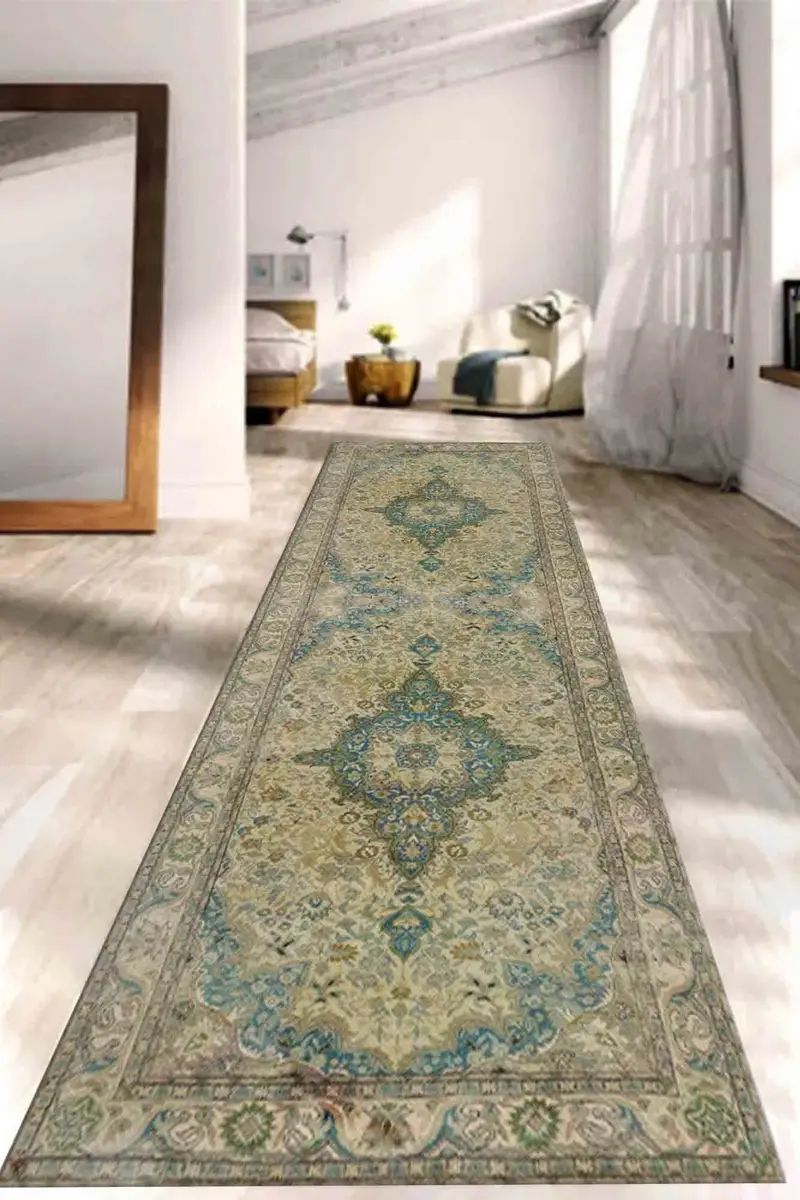 Çiçekli Yeşil & Kahverengi Vintage Oushak Baskılı Halı