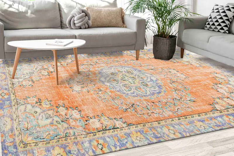 Yumuşak Turuncu ve Mor Çiçek Madalyonlu Vintage Türk Baskılı Halı