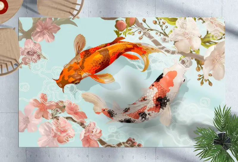 Turuncu Koi Balık Zen Soyut Baskılı Halı, Modern Japon Tasarımı