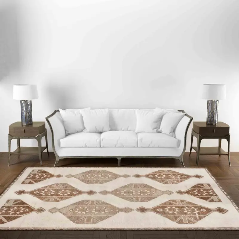 Kahverengi Vintage Türk Baskılı Halı, Bej Boho Geometrik Desenli