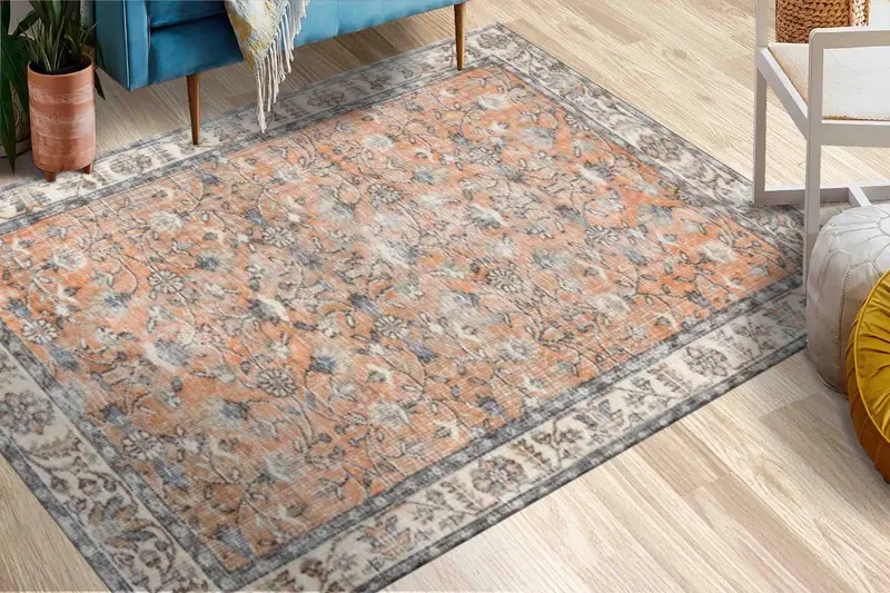 Çiçekli Turuncu Baskılı Halı, Etnik Boho Vintage Türk Tasarımı
