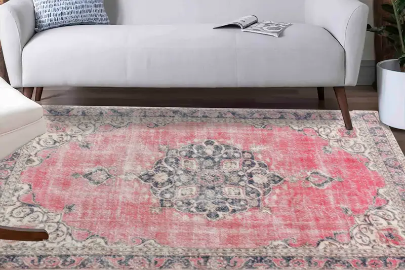 Madalyon Vintage Türk Baskılı Halı, Soluk Sönük Çiçek Desenli