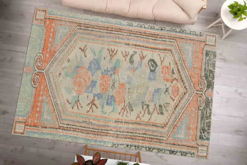 Yumuşak Turuncu ve Yeşil Tonlu Vintage Türk Baskılı Halı