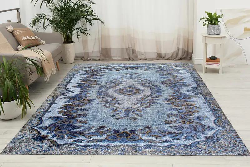 Vintage Madalyon Baskılı Halı: Türk Etnik Çiçek Desenli