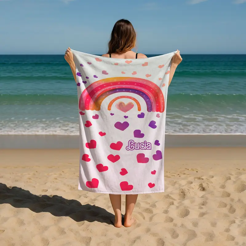 Çocuklar için Kişiselleştirilmiş Gökkuşağı Plaj Havlusu – Kalpli Özel İsimli Havlu – Kız ve Erkek Çocuklar için Sevimli Renkli Yaz Havuz Havlusu Hediyesi