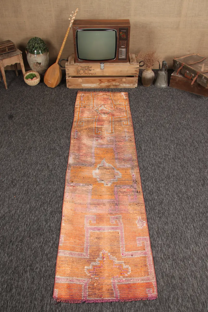 2.4x8.7 ft Halı, Türk Vintage Halısı, Herki Turuncu Geometrik Halı