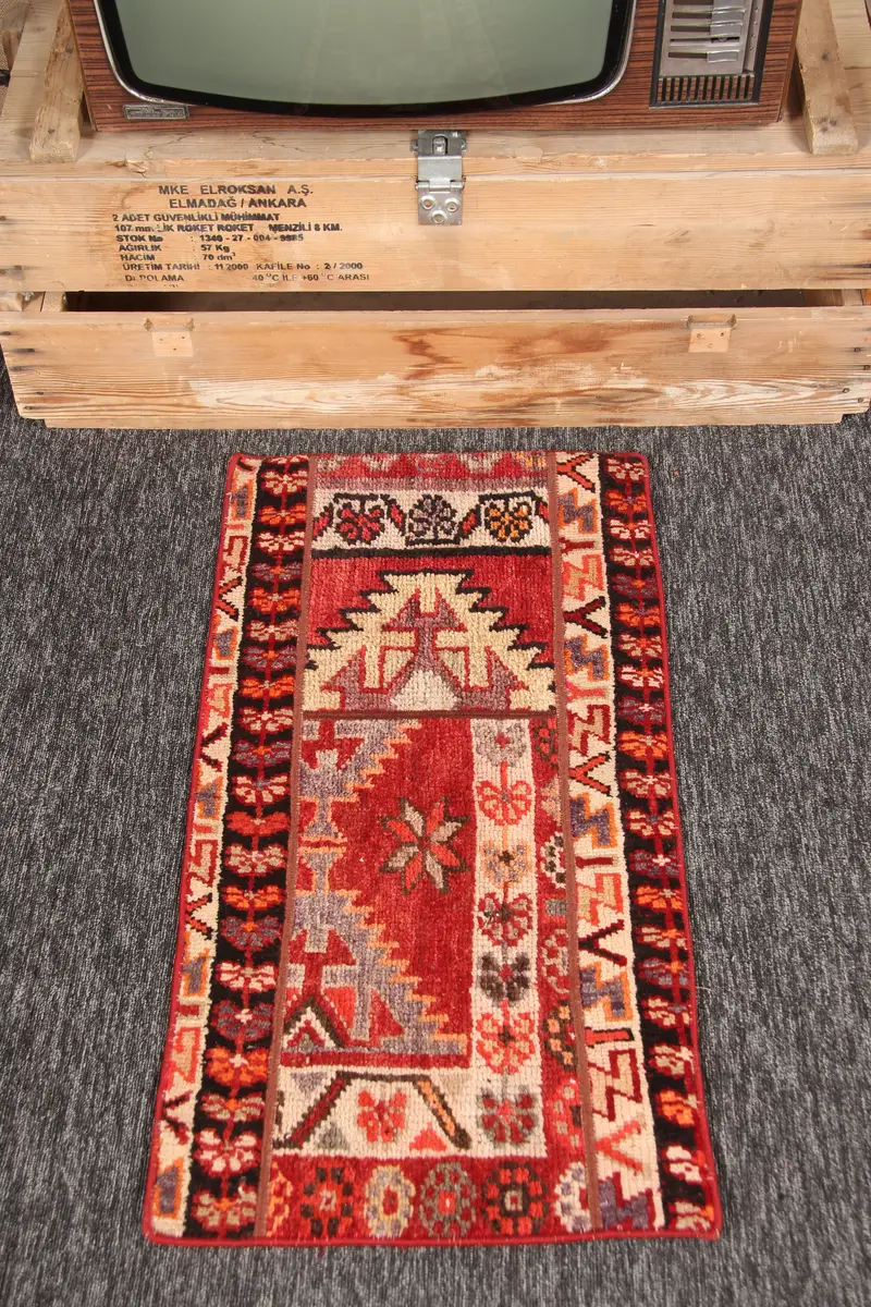 1.5x3.1 ft Vintage Halı, Küçük Türk Halısı, Kırmızı Geometrik çiçekli Halı