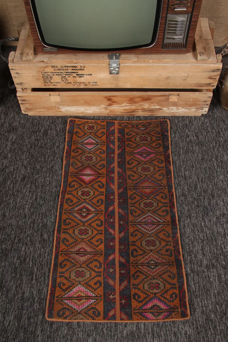 Vintage Türk Küçük Halısı 1.8x3.3 ft, Patchwork Kahverengi Halı