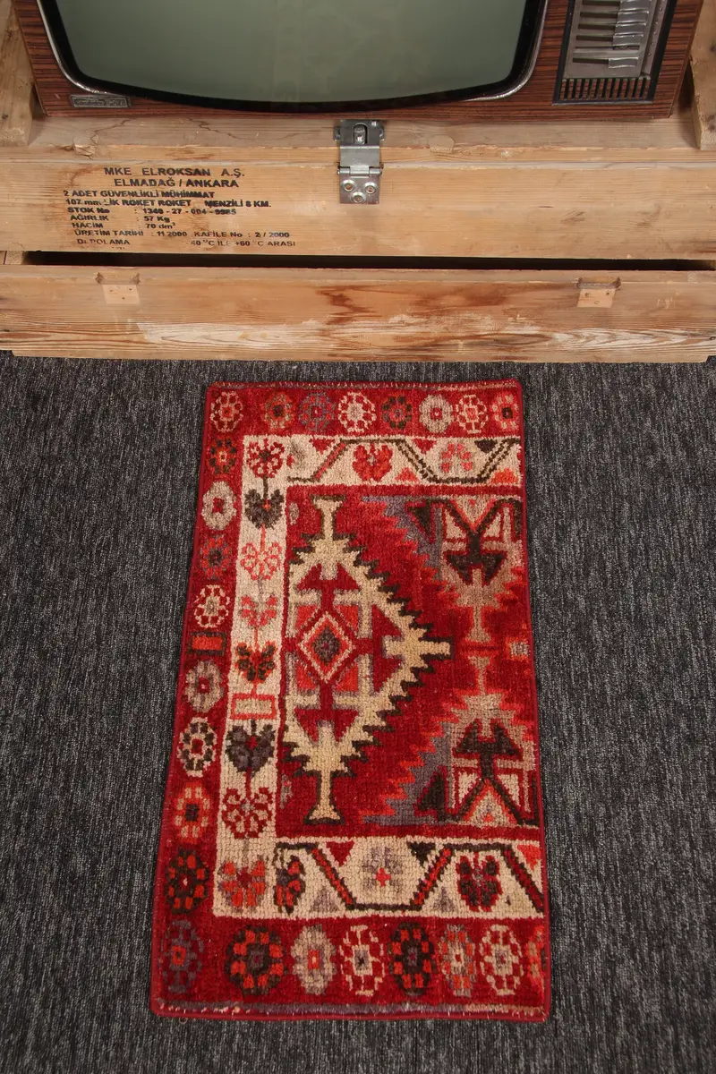 1.4x2.7 ft Vintage Halı Halı, Çiçek unsurlu Kırmızı Geometrik Türk Halısı