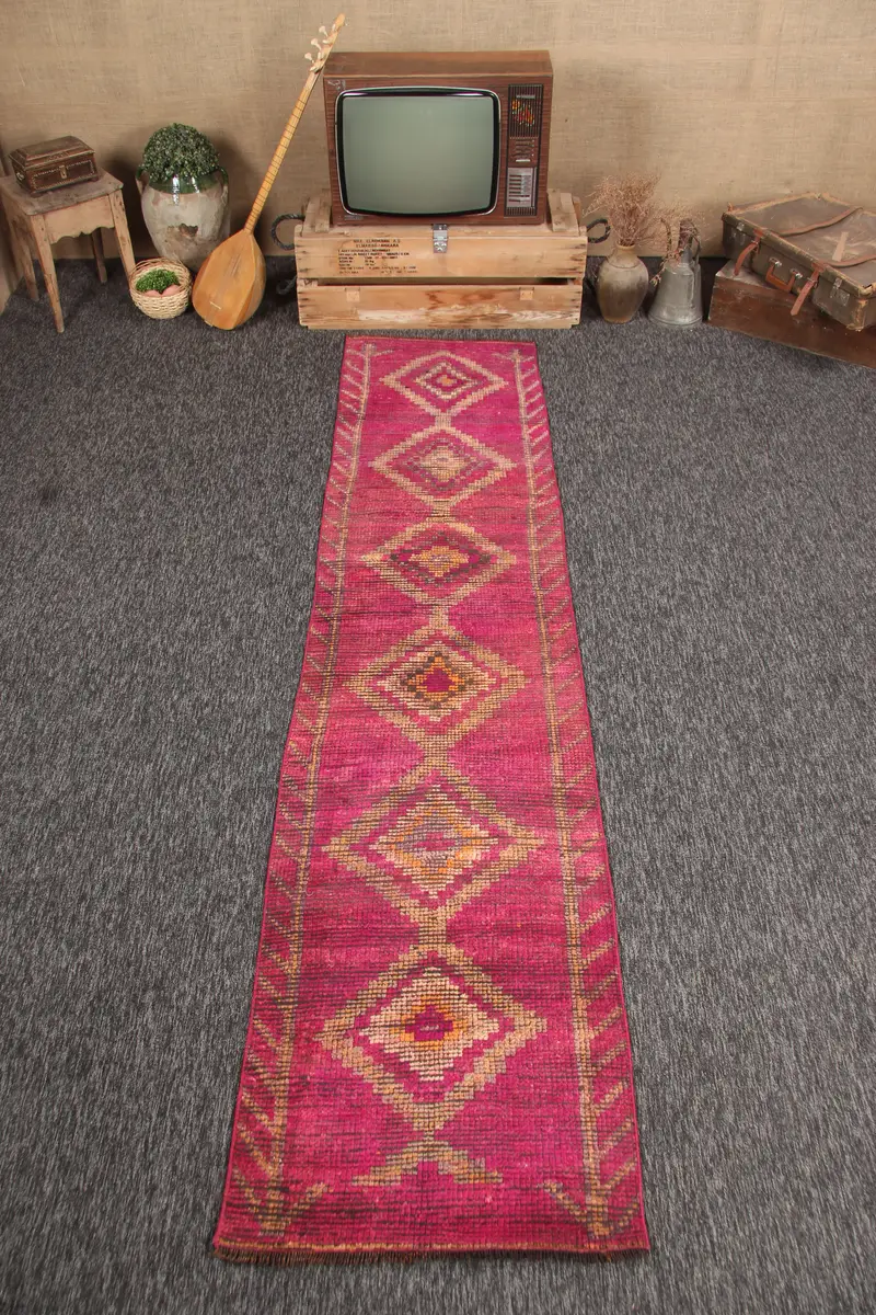 Vintage Halı, 2.3x9.6 ft Küçük Halı, Pembe Geometrik Türk Halısı