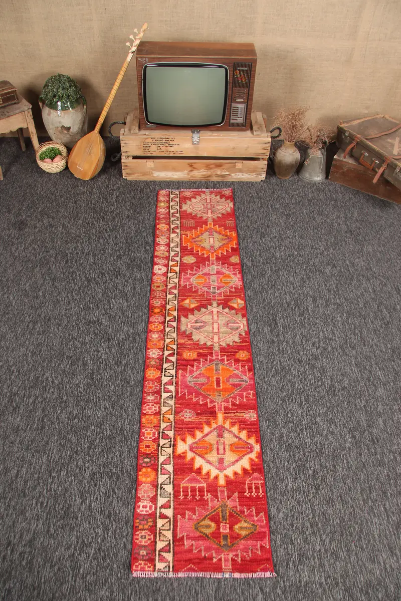 Vintage Küçük Halı 1.7x7.6 ft, Kırmızı Geometrik Türk Halısı