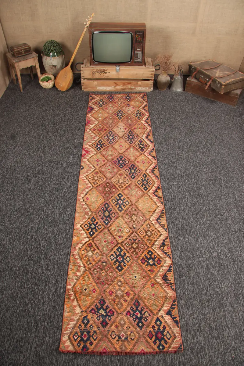 Vintage Türk Halısı 2.5x10.3 ft, Turuncu Herki Geometrik Halı
