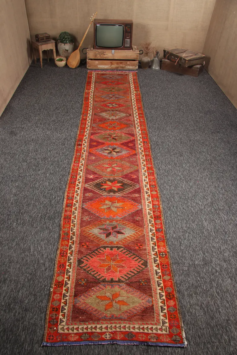 Türk Vintage Küçük Halı 3x15,8 ft (90x482 cm), Çiçek unsurları ile Turuncu Geometrik Herki Halı