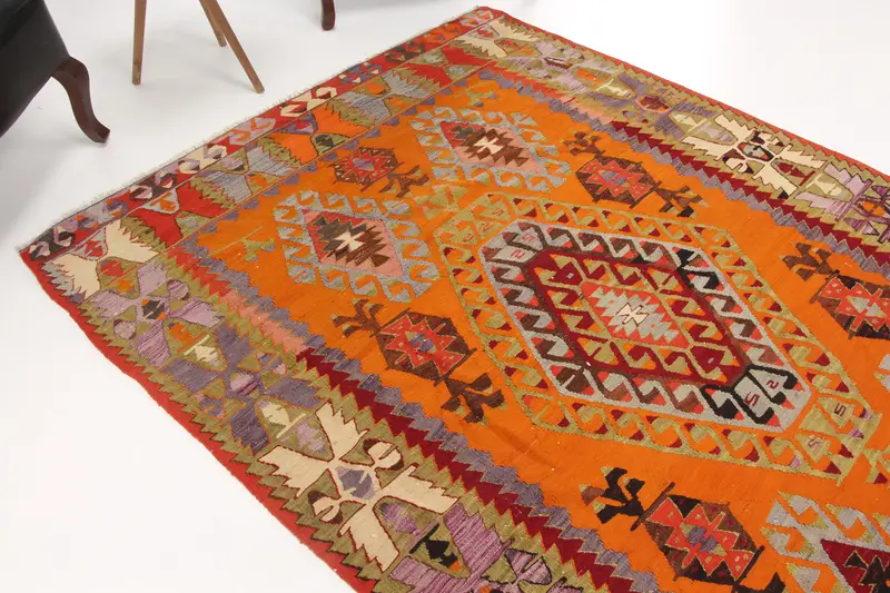 5.1x8.5 ft Eski Türk Halısı, Büyük Halı, Turuncu Çiçekli Halı