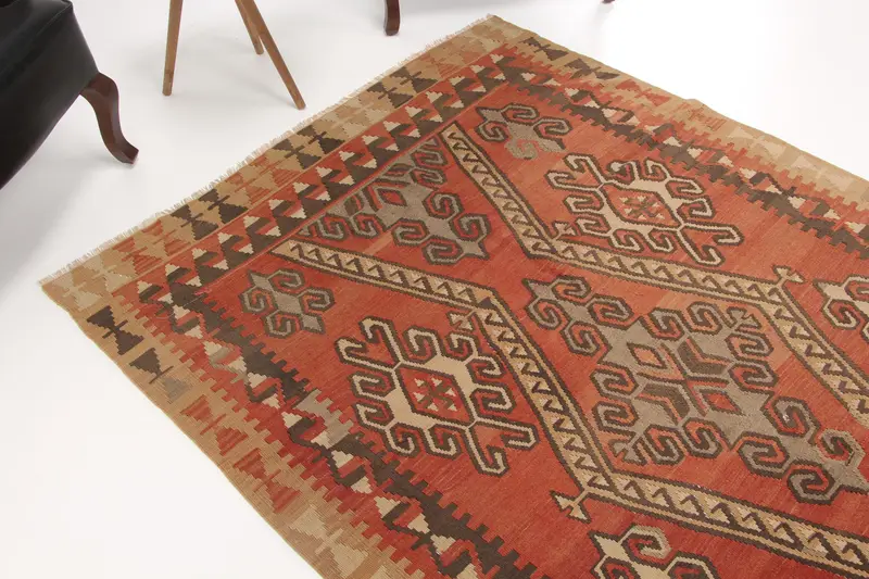 Vintage Türk Büyük Halı 4.8x10.2 ft, Turuncu Kahverengi Kareli Yün Halı