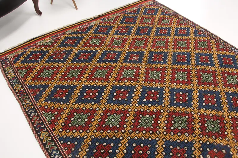 6.7x9.2 ft Büyük Türk Halısı, Vintage Halı, Mavi Kırmızı Soyut Yün Halı