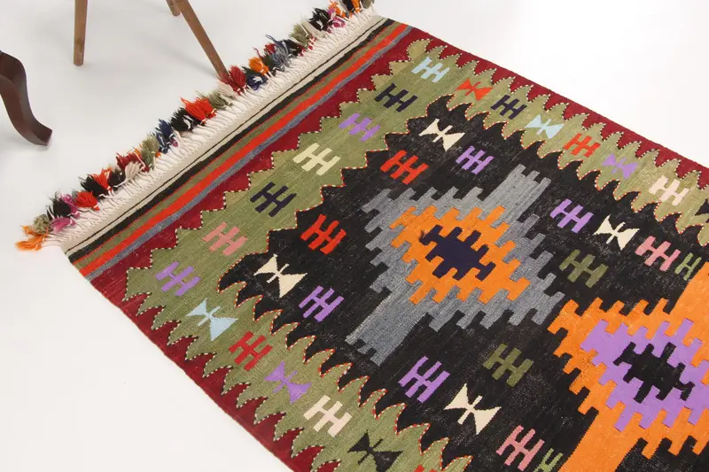 Vintage Halı 3.5x6.1 ft, Kırmızı Yeşil İkat Yün Türk Halısı