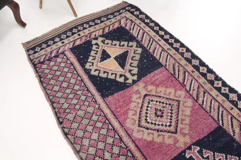 Vintage Türk Halısı, 3.3x8.8 ft Halı, Pembe Mavi Bordürlü Yün Halı