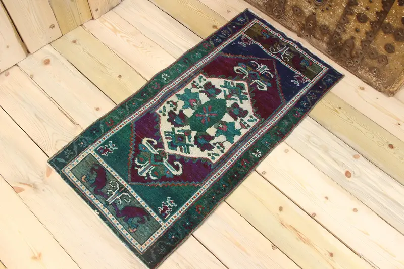Türk Halısı, 1.6x3.2 ft Vintage Halı, Mavi Yeşil Hayvan Baskı Yün Halı