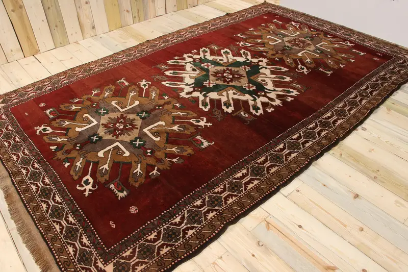 Türk 6.5x10.6 ft Halı, Vintage Halı, Kırmızı Kareli Halı Yün