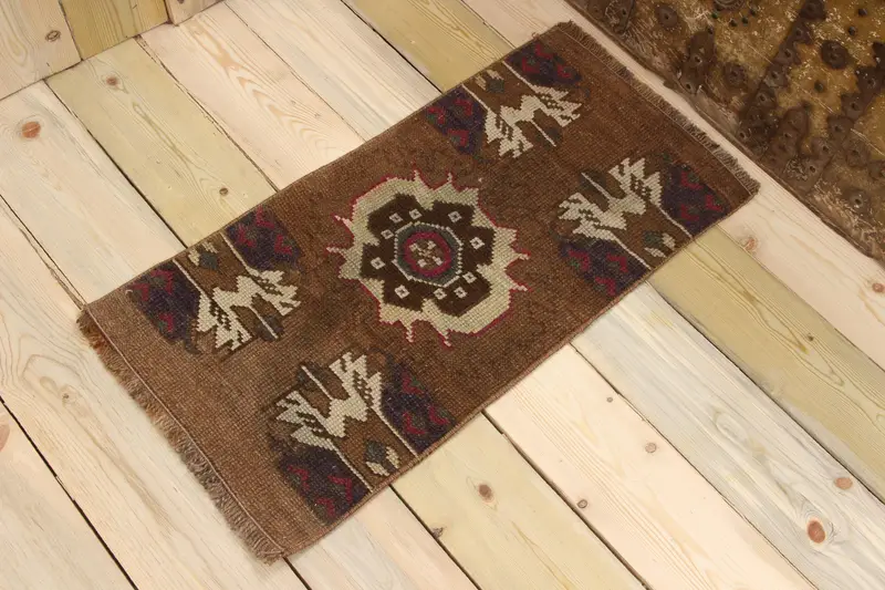 1.3x2.7 ft Halı, Vintage Halı, Türk Kahverengi Yün Çiçekli Halı