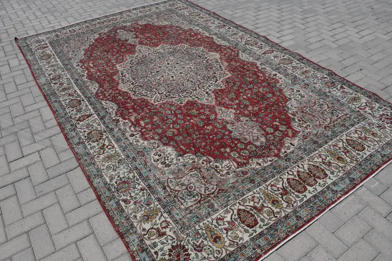 7.3x11.6 ft Türk Halısı, Vintage Halı, Kırmızı Bitkiler ve ağaçlar Yün Halı