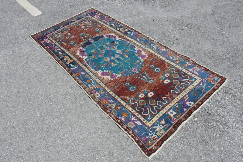 3.6x7.6 ft Halı, Vintage Türk Halısı, Mavi Puantiyeli Yün Halı