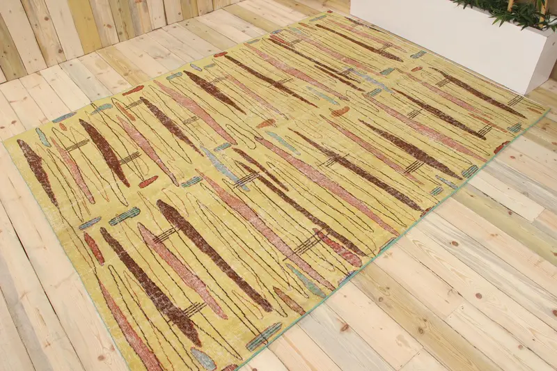 6.4x8.8 ft Vintage Halı, Sarı Çizgili Türk Yün Halısı