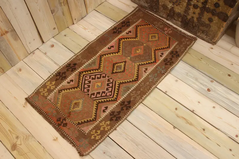 Türk Vintage Halı 1.9x3.6 ft (59x109 cm), Kahverengi Bitkiler ve ağaçlar Yün Halı