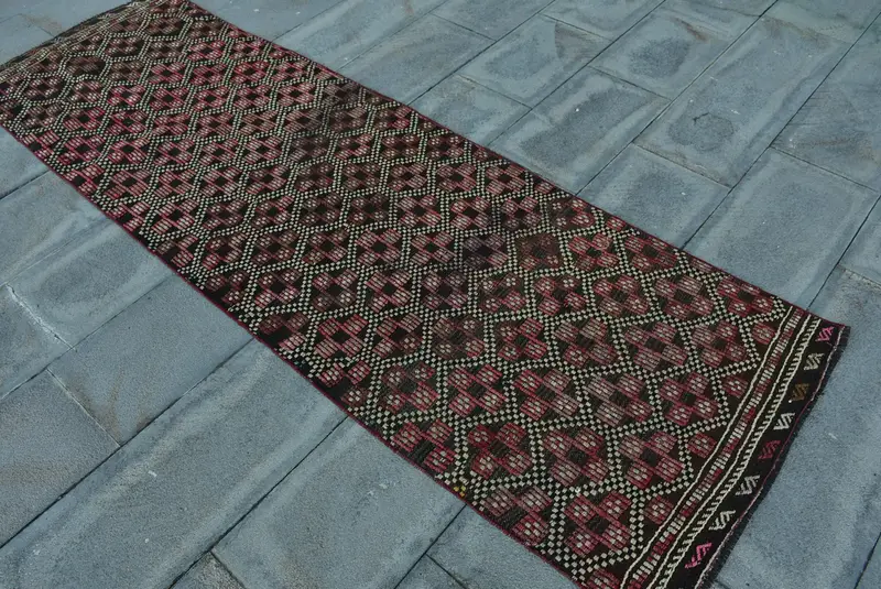 2.6x8.3 ft Vintage Halı, Türk Yolluk Halısı, Kırmızı Siyah Çiçekli Yün Halı