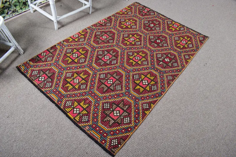 Türk Vintage Accent Halı 3.6x5.3 ft, Kırmızı Mavi Katı Yün Halı