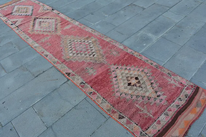 Vintage Türk Halısı, 2.6x12.3 ft Runner Halısı, Kırmızı Fas Halısı
