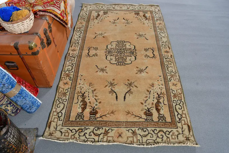 Vintage 3.6x6.46 ft Halı, Türk Vurgulu Halı, Kahverengi İkat Halı