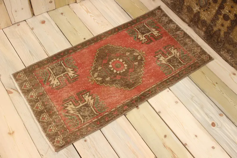 Türk Vintage Küçük Halı 1.6x3.3 ft, Kırmızı Puantiyeli Yün Halı